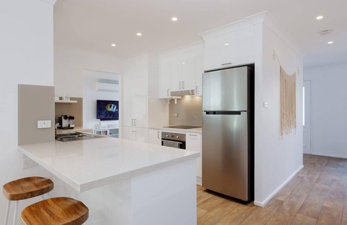 Entering the home you’ll be positioned in the open-plan living hub with stylish furnishings and chic fixtures with the accents of comfortable soft neutral finishes that make for a luxurious and welcoming ambience. The living area has a split system air-conditioner, free Wifi and a large wall mounted Smart TV.