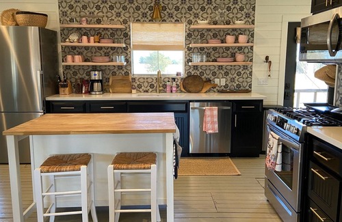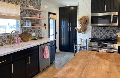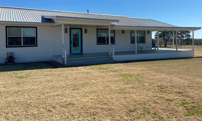 acres with a fabulous antique party barn and huge swimming pool. Farmhouse recently remodeled to studs- sleeps 8 comfortably. All bedrooms appointed with luxurious bedding and blackout shades. Open kitchen / living is the perfect spot to cook and relax after a day of shopping or lounging by the swimming pool. Antique barn built out into an amazing party space with full kitchen, half bath + outdoor shower, surround sound speakers, large screened porch, bar, and huge party space. Enjoy Morning coffee on the porch, cocktails at dusk and perhaps a deer sighting, s'mores by the fire pit and gorgeous sweeping views of Austin county. Location is spacious and private and but right in the middle of Roundtop, Brenham and Fayetteville for quick access to amazing antique shopping and great restaurants. It's the perfect spot for a group getaway with plenty of space to spread out.