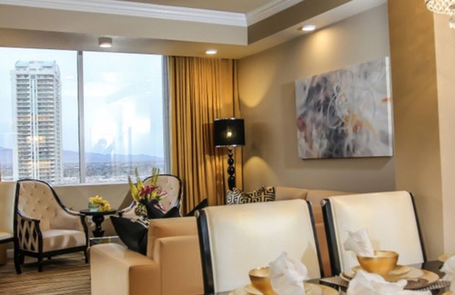900 Square foot villa with 2 beds (one Queen pull-out) 1 bathroom. A full suite with bedroom, kitchen, living room, and even a luxurious jacuzzi tub, this is an amazing option for your Vegas stay. Located at the Westgate Resort and Casino and right at the Westgate Monorail Station, the villa provides easy access to the Vegas Strip and incredible views of the surrounding Las Vegas Valley.