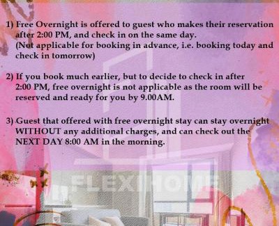 Check-in time for Cyberjaya apartment starts counting from 9:00 AM and check-out is until 8:00 AM. However, early check-in or late check-out can sometimes be negotiated between the guest and the owner or the manager of this property.