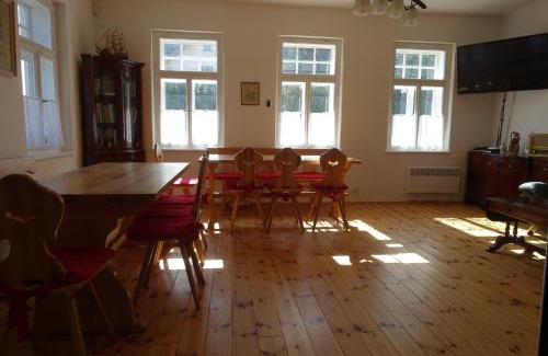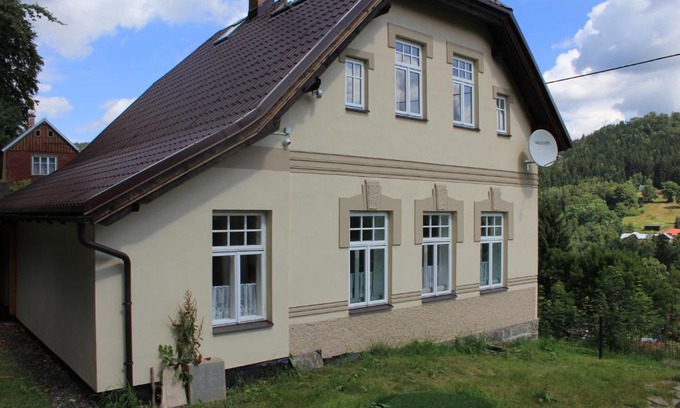 Featuring a garden, Ašika features accommodations in Josefŭv Dŭl. This chalet provides free private parking, a shared kitchen, and free Wifi. The chalet has a children's playground and a sauna. Providing a terrace and mountain views, the spacious chalet includes 3 bedrooms, a living room, satellite flat-screen TV, an equipped kitchen, and 1 bathroom with a shower. Guests can enjoy a meal on an outdoor dining area while overlooking the garden views. For added privacy, the accommodation features a private entrance. Guests can make the most of the warm weather with the property's barbecue facilities. Skiing and cycling can be enjoyed nearby, while a bicycle rental service and ski storage space are also available on-site. Ještěd is 19 miles from the chalet, while Szklarki Waterfall is 20 miles from the property. Pardubice Airport is 78 miles away, and the property offers a paid airport shuttle service.