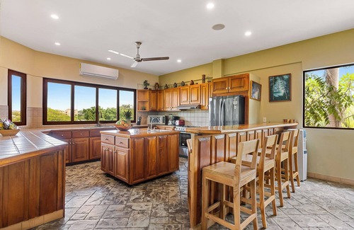 Located on a hill with sweeping panoramic views overlooking Tamarindo Bay, yet just steps from the ocean, Casa Papaya is a three story custom home with 5 bedrooms equipped with 3 king size beds and 2 queen size beds with fans & a/c, 3.5 baths, entry lobby with coffered wood ceilings, large kitchen with island & bar, local hand carved hardwood doors and headboards, wood windows, 2 large decks with teak furniture, secure 2 car parking . Casa Papaya boasts a very large private pool area with a pool rancho . Casa Papaya offers complete comfort for up to 5 couples plus 1 . With 3 king size beds and 2 queen size beds and 1 single bed choosing a room will be no problem . Casa Papaya recently upgraded with new air conditioning through out makes every single room very confortable even during the hottest months of the year .