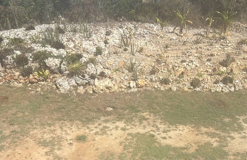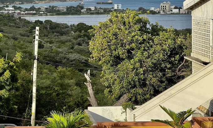 A one bedroom with a full kitchen, living space, dining, laundry area, TV, air conditioning and internet. It has a pouch over looking South Hill and Sandy Ground. It sits in a fenced big back yard featuring various fruit trees.