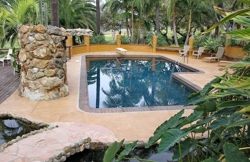 It features organic fruit trees, three private patios with waterfalls abound, including frogs and koi fish.