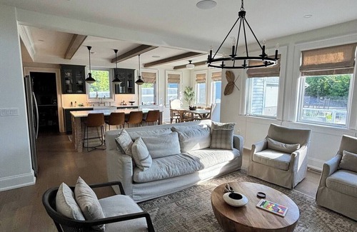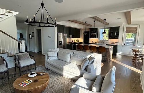 The main floor, open-concept living room and kitchen is an entertainer’s dream. Cook a great meal with top-of-the-line appliances and enjoy socializing with your guests. The kitchen also includes a French press, Keurig coffee machine, and kettle for all your caffeine needs! The living room features modern, comfortable furniture and a 55" Smart TV. There is also a main-level office available for guests needing to work while using the home.
