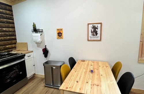 Inside the cabin, the open-plan living area is filled with natural light and wooded views through large windows. The sectional couch and live-edge coffee table create a comfortable space to unwind, and the wooden bookshelves and chest filled with crafts, a turntable, and a wireless phone charger add charm and functionality. The fully equipped kitchen includes a stove, dishwasher, microwave, toaster, Keurig coffee maker, and all necessary cookware and utensils. Enjoy meals or snacks at the pine dining table.
