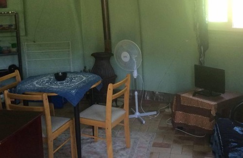 A pot belly stove keeps things warm and toasty inside on a cold night. Pure mountain spring water is gravity fed for drinking and showering.