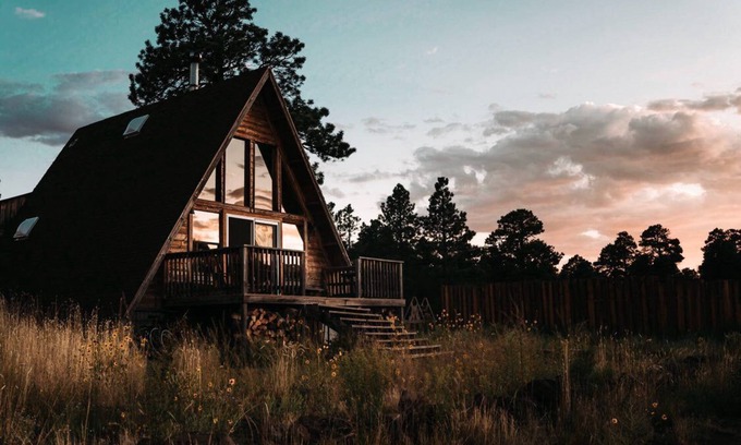 Tiny house A-Frame on 1.5 acres in the Coconino National Forest. Dog friendly and has on-site trail access. Featured in American Eagle Outfitters worldwide holiday campaign. Also featured on Travel + Leisure, Real Simple, Food and Wine, W, People, and Sunset magazines as Arizona's most wished for A-Frame cabin last year. Epic glamping and stargazing. 10 minutes to historic downtown, Route 66, and Lowell Observatory. 15 minutes to Arizona Snowbowl, Walnut Canyon, Sunset Crater, Wupatki National Parks, NAU, and Twin Arrows Casino. 30 minutes to Meteor Crater, Oak Creek, and Sedona. 90 minutes to GRAND CANYON National Park, Lake Powell, Horseshoe Bend, Antelope Canyon, and the Petrified Forest National Park. 2.5 hrs to Monument Valley. Our listing "Tiny Mountain View Sauna Cabin" with a full sofa bed, kitchen, and bathroom next door is also available if you need more space. Check out additional photos on Instagram @aframeflagstaff STR-24-0876