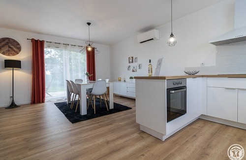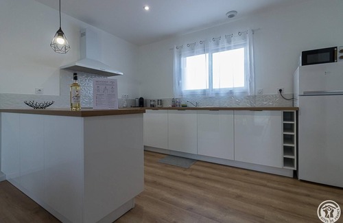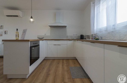 In the heart of the Fronton vineyard, in an area a little away from the city, the A L'Orée du Roc cottage is a contemporary, independent villa, built on land adjoining that of the owners' home. The house benefits from a large private enclosed garden. A parking area is reserved in the courtyard, as well as a room for parking motorcycles or bicycles. The cottage also offers a covered terrace, which accommodates garden furniture, barbecue and relaxation lounge. Pets not allowed. Non-smoking cottage. Located in a calm and relaxing environment, on the edge of the village, 2.2km from the center of the town of Fronton (shops, services, restaurants, etc.), this cottage will meet the expectations of both professional and holidaymakers. Just 30km from Toulouse and Blagnac airport, guests will find a wide range of activities to entertain themselves: wine estates all around, equestrian center 200m away, tennis, hiking and fishing trails 2km away, cycle path 10km away, swimming pool 17km away, swimming lake with water sports 28km away. The gîte de L'Orée du Roc is laid out on one level: entrance opening onto the living room with American kitchen, dining area and lounge. Pantry/laundry room adjoining the kitchen. A corridor leads to the night area of the house with 3 bedrooms (1 double bed 140x190cm) (1 double bed 160x200cm) (a children's bedroom with 2 single beds 90x190cm bunk beds + baby bed), a bathroom with shower and bathtub, a separate toilet. Electric heating. Wifi internet connection (fiber).