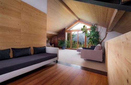 The attic is a large living room with a big couch, a satellite tv (50 inches) and a balcony.