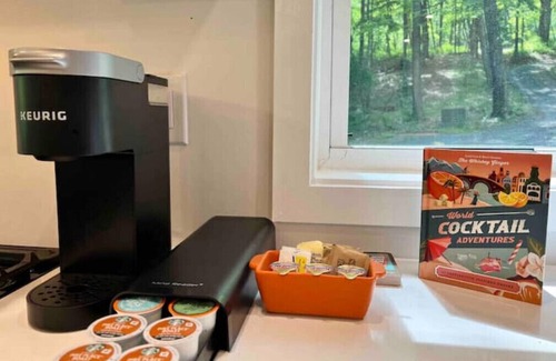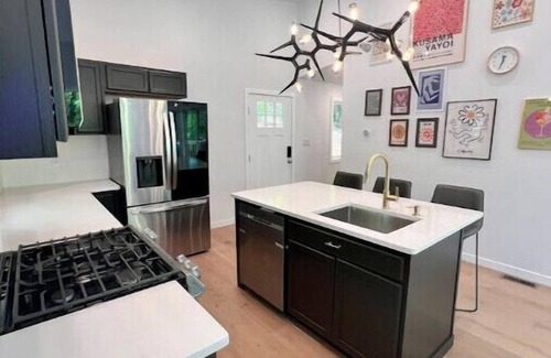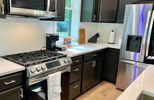 The kitchen features brand-new appliances ready for your culinary experimenting, fully stocked with all necessary small appliances, flatware, cutlery, glassware and more. There is a Keurig coffee maker. The stove is gas fired and tap the fridge glass 3 times to light up the peek-a-boo window. There is also a charcoal Weber grill on the deck for your use.