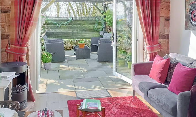 Shower Room: Walk-In Shower, Toilet. Electric central heating, electricity, bed linen, towels and Wi-Fi included. Welcome pack. Front garden with garden furniture and electric outdoor cooking grill. Private parking for 2 cars. Electric car charging point (at cost, payable directly to owner). No smoking.. A picture-perfect property to spend your well-deserved break. As you drive up to Little Pines Lodge the first thing you will notice is how pretty it is. A dry-stone wall surrounds the front of the property with the exterior of the property cladded and the location making the most of the fabulous nearby rolling hills. Enter this thoughtfully converted space and you will discover vaulted ceilings, quirky bespoke furniture, and kitchen along with quality soft furnishing and a real eye for interior design flowing throughout the property. Enjoy the open plan feel of the lodge which boasts a cosy double bedroom perfect to relax after a busy day. A well-designed walk-in wet room really adds style to this property. The separate living/kitchen/dining area has patio doors leading to the private outdoor space where there is an electric outdoor cooking grill. Venture outdoors and you will be greeted by a landscaped seating area with comfy sofa and chairs a great place to grab a bottle from the fridge and make the most of the sweeping rural views and lose yourself in nature.