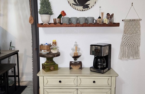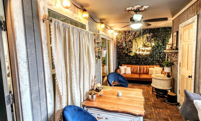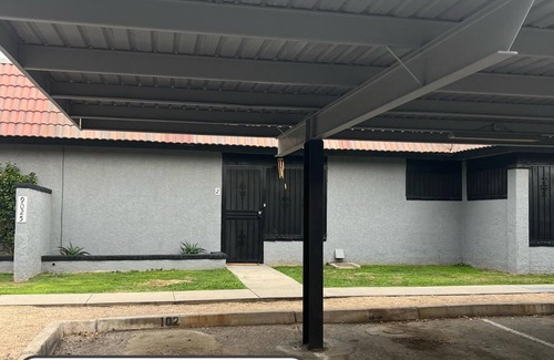This quiet, cozy & unique space, is tucked away 4 min./1.6 + miles from State Farm Stadium (can be seen from front door), Westgate Entertainment District, Top Golf, Desert Dimond Casino & more. At 803 sq ft, this condo has 2bd (1 King / 1 Queen/4 inch, full size, foldable mattress & metal bed frame) 2 bath, full kitchen, 3 Tv's & coffee bar. The living room has comfortable seating, Full body massage chair & 65" Crystal UHD 4k. Enclosed porch equipped with seating, board game table, security door & curtains for privacy.