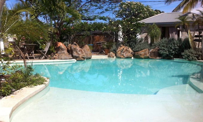 Bungalow with 2 bedrooms, one air-conditioned and the other ventilated, Balinese bathroom, pool house (consisting of an equipped kitchen, a bar, a dining area, a lounge to relax) .Magnificent green setting on the edge of a large salt pool. The pool is to be shared with the owner. The entrance to the rental is independent. Close to the beaches, the lagoon and various activities (golf, diving, boating, parachuting, hiking...) Booking conditions: Children must know how to swim - We prefer not to accommodate young children. When making your reservation, please confirm the age of your children in writing.