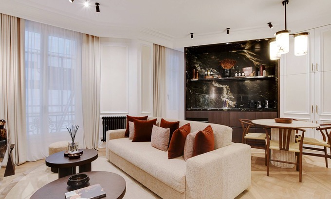 Tastefully and delicately decorated, each space reflects contemporary Parisian elegance and refinement. Every detail has been meticulously thought through, from the noble colours to the timeless parquet flooring and carefully selected design elements, to create a warm, luxurious atmosphere of the highest standard.
