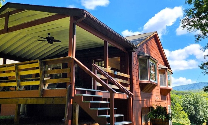 Newly renovated, romantic get-away cabin secluded at the end of a gravel road. The property is located within a 2000 acre wildlife corridor and has private frontage on a deep-water stretch of the Shenandoah known for small mouth bass fishing. Enjoy a spectacular panoramic view of the Blue Ridge from the cabin’s front porch. At dusk, watch turkey and deer on the lawn and meadow below the house. Grill and dine outdoors on the extensive back deck sheltered by woods. Large, well-equipped kitchen with breakfast counter. Starlink internet. Picnic, swim, and fish at the waterfront pavilion below the house. Portable chairs, towels, and wood for the pavilion’s fire ring are kept at the cabin for river use.