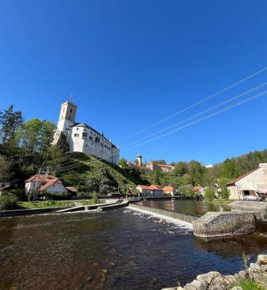 A room by a weir with a view of Rožmberk Castle is located in Rožmberk nad Vltavou.