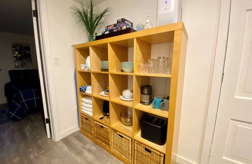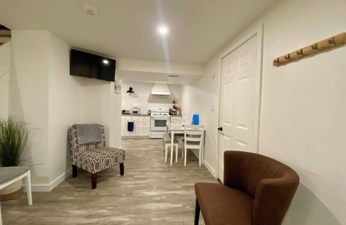 This new two bedroom space is bright and roomy. Located on a quiet side street surrounded by mature trees, privacy and relaxation begin as you pull up the driveway to your parking spot. Easily unload next to the side entrance and use the entry hall for bikes, water toys, and other items. A few steps further and you enter the bright spacious living area. Hi speed internet, smart TV, and plenty of room to stretch your legs. Create delicious food in a fully equipped kitchen with full size fridge and stove. Grab some beach towels and hit the beach for a swim or lay in the sun. Sand in your shorts? No problem, just toss your dirty laundry in the machine and you're ready to go! The bathroom has a tub/shower combo so you can soak after a long day of hiking or have a quick shower before heading out. The first bedroom offers a super comfy Queen bed and lots of places to stow your clothing. The second bedroom has two twin beds that can be brought together for a cozier sleep. Lots of room here for clothes storage as well. Each bedroom has two above ground windows and privacy glass doors for lots of natural light.