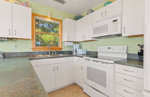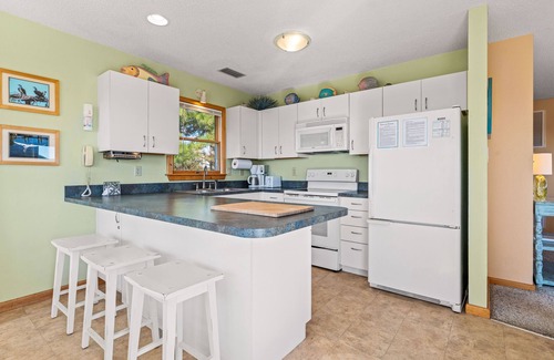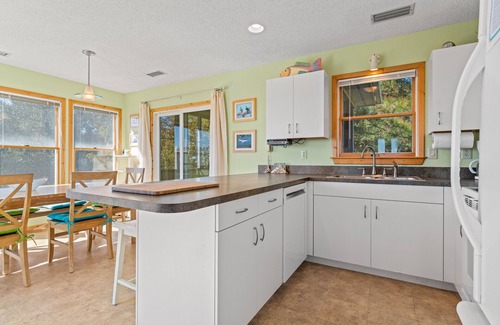 Enter the home through the carport door with a keyless entry keypad. In the carport's exterior space, there is a large, roomy changing area for getting into your beachwear and a separate shower area with 2 showerheads to rinse off after beach-going. An outside picnic table is located in the side yard (no grill is available). Lastly, the home is equipped with fun outdoor items for activities that your family may enjoy including the use of 2 kayaks! There is parking for 2-3 vehicles in the driveway.