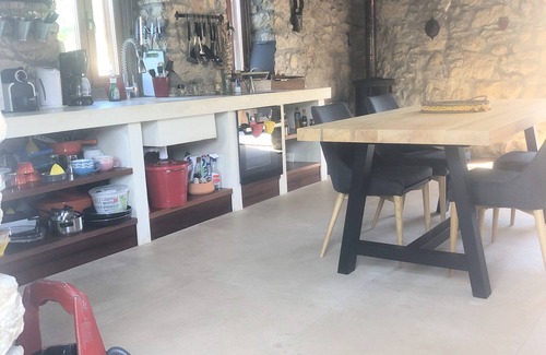 Fully equipped kitchen with wood burning stove and all the comforts.