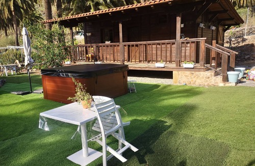 Beautiful wooden cabin, unique of this style in Fataga, of 60 m2, completely new and equipped, with a bedroom with two single beds (90 * 190), bathroom with shower, living room with sofa bed for two people, baby cot and kitchen with all utensils (ceramic hob, microwave, refrigerator, washing machine, toaster, coffee maker, juicer, etc.).