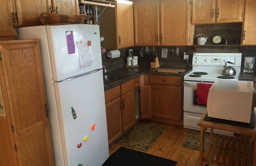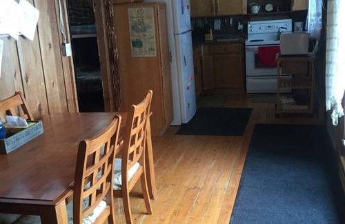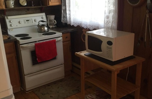 This two bedroom cottage is right on the water of Lake Catchacoma. It offers safe swimming and boating. The kitchen has stove, fridge, toaster, coffee maker, blender, kettle, glasses, pots and pans and dishes and cutlery.