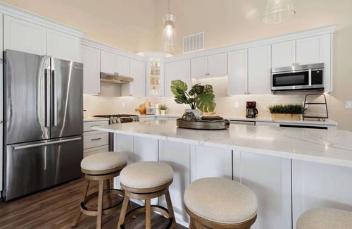 Heading indoors, bright and modern spaces provide much-needed rest and rejuvenation after long days adventuring in and around the lake, where everyone can spread out and find their own cozy corner. Sink into plush sofa seating in the living room while you stream all your favorite shows and movies on the smart TV. The open floor plan flows you right into the stylish kitchen, where home cooked meals come to life with help from stainless steel appliances, glossy stone countertops, and sleek cabinetry stocked with all the comforts of home. Gather the whole crew for formal dining at the circular table with seating for 6 or keep things casual up at the island on high-top stools for 4.
