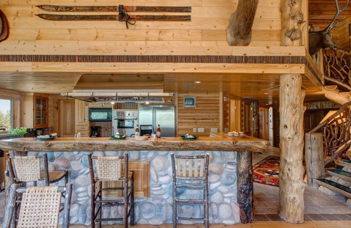 Situated in the enviable top floor corner location, Black Bear #301 boasts some of the best views in the lodge. Breathtaking vistas of Empire pass and beyond can be fully enjoyed from the private deck while soaking in your personal hot tub. In traditional mountain west style, vaulted ceilings and a large stone fireplace bring light and warmth to the spacious living area. Touches of the old west are remembered throughout in the way of decor and artifacts. Relax and sink into the big comfortable sofa and chairs and enjoy the meditative flames of the gas fireplace or a movie on the flat screen TV. The adjacent dining area can seat six with more room for three at the kitchen counter. On the other side of the dining area is another cozy conversation space where the adults of the group can enjoy a peaceful conversation and indulge in a glass of wine.