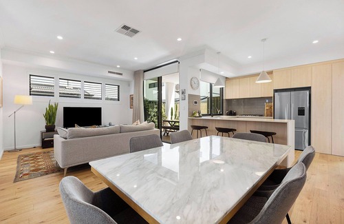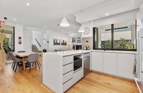 A beautifully styled contemporary two-story home that offers comfort and convenience for families or professionals. Upstairs, unwind in the master suite with a king bed, private ensuite, and walk-in wardrobe. A second king bedroom and a twin room with two single beds are also located upstairs, accompanied by a spacious main bathroom with a bathtub. The fourth bedroom, complete with a queen bed and a bathroom nearby, is conveniently located downstairs. In total, the home offers three well-appointed bathrooms, ideal for multi-generational groups or those seeking extra privacy.