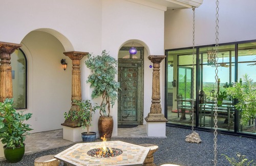 This custom home is a one-of-a-kind property with sweeping canyon views of the back patios and balconies. The home boasts a refined collection of décor that celebrates the world traveler. Enter through the Zen-filled courtyard through the imported doors to find the gourmet kitchen, dining table and living room with floor to ceiling windows. The media room is also in this main house and can be a sleeping area.