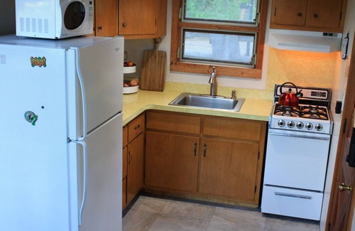 Fully equipped kitchen with new floor and paint, plenty of good quality cookware and utensils, new microwave and fridge, plus a coffee maker and toaster.