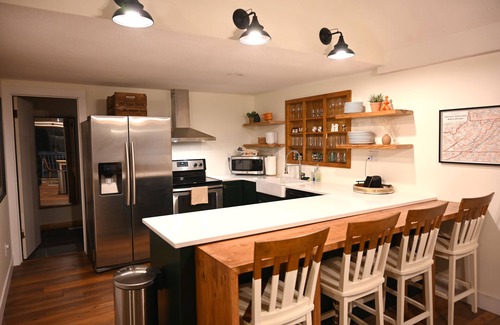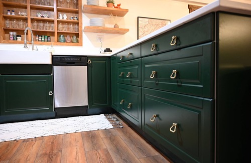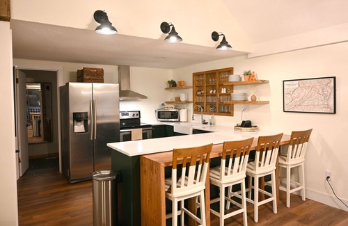 The newly renovated kitchen boasts hunter green cabinets, gold accents, and open shelving. Featuring a stainless-steel range, apron sink with garbage disposal, full-sized stainless-steel refrigerator with water and with an icemaker, microwave, toaster, and dishwasher, this kitchen makes cooking and cleanup easy. A large expanse of new quartz countertops makes it easy to prep and serve food. The stocked cabinets include pots, pans, baking sheets, bowls, and even olive oil and spices. To keep the chef company, guests can face the kitchen on bar stools at the custom-built wood table. A full-service coffee bar includes all you need to brew your cup or joe or fix a cup of tea.