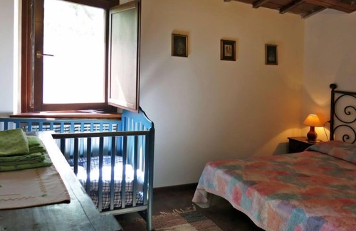 "Acqua Santa (AIT100)", 5-room farmhouse 110 m2 on 2 levels. Rustic and tasteful furnishings: living room with open-hearth fireplace, TV and CD-player. Exit to the garden. Dining room with dining table. Kitchen (4 hot plates, oven). Shower/bidet/WC. Heating. Upper floor: 1 room with 3 beds. 2 rooms, each room with 1 french bed (160 cm). Shower/bidet/WC. Wooden floors. Very beautiful panoramic view of the mountains, the valley and Monte Camicia (2556 m). Facilities: washing machine, baby cot for up to 2 year olds. Internet (WiFi). When there are less than the maximum number of guests staying at the property, not all of the bedrooms will be available for use.