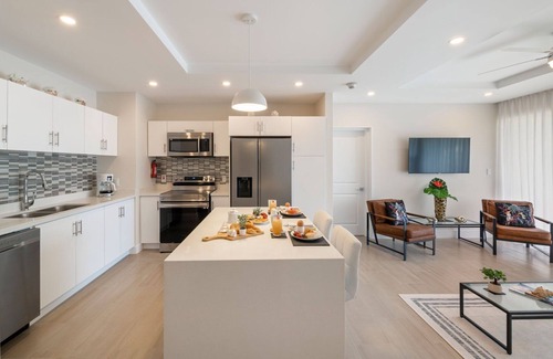 As you enter, the airy open-style layout welcomes you, showcasing a modern aesthetic with chic decor in soothing hues of blue and accents of radiant gold. The kitchen's inviting island beckons for leisurely morning gatherings over breakfast, creating cherished moments with loved ones.