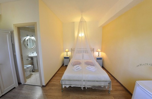 This room forms part of Adamantia Traditional Apartments & Studios and is located in Gaios, the capital of Paxos. It is on the ground floor and has a courtyard where the guests can enjoy the view of the surrounding olive trees and the Ionian sea in the background.