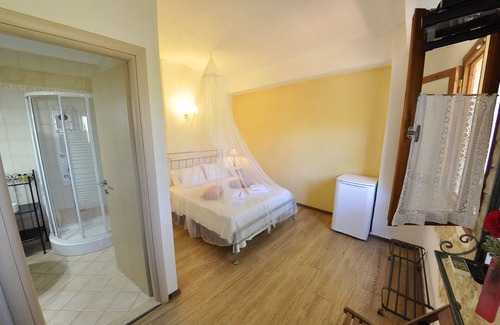 It has a double bed with orthopaedic mattress, air-conditioning, flat screen TV, refrigerator-freezer and the bathroom features a shower with hydromassage. This room is ideal for couples! A baby cot can be provided at no extra cost.