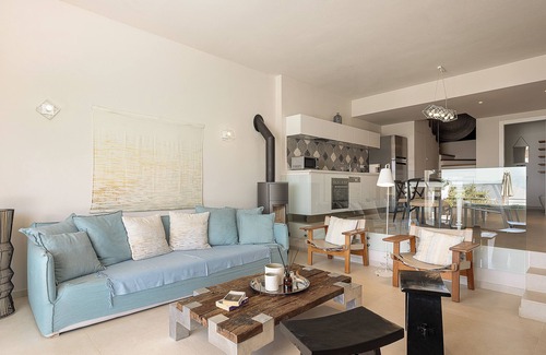 The ground floor is split into two levels - separated by 3 steps: on the upper one stands a fully equipped kitchen and a large wooden dining table, on the lower the living room with the comfortable large linen sofa. On the same level, there is a queen size bedroom with an en-suite bathroom, fitted with a marble sink, teak furniture, and a shower column with hydro massage. On the first floor, two bedrooms are carefully located on two opposite ends to ensure the complete privacy of the guests, and each comes with its own terrace. The first bedroom features a split king bed that can be separated or joined, depending on the guests needs. All bedrooms can guarantee a maximum sleeping experience thanks to the top-notch mattresses, the pillow selection service, and the large TV screen. The romantics will find refuge in the canopy bed of the second room, dotted with a large terrace furnished with sun loungers.