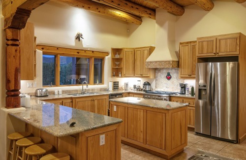 Beautiful modern Adobe villa with 360º views of Taos Mountains and entrance to Carson National Forest, Fully equipped kitchen, 2 terraces with fire-pit, 3 Bedrooms, 2 Bathrooms with bathtubs (one with jetted tub), and one 1/2 bathroom. Heated Garage, Laundry Room, and fiber-optic high-speed internet.