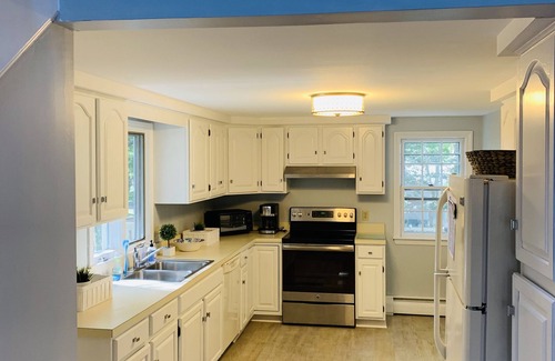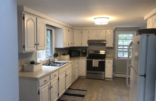 Renovated in 2017 and just updated to white kitchen cabinets. The home has a great beach feel. We Love this location. You can see the ocean from the front yard.... that's how close we are to the beach. A 3 minute walk to beautiful Popponesset beach! Renovated the home Spring 2017. We purchased the house from the original owner in August of 2016. Our family owns two other homes on this 14 house dead end street. Walk six houses and down a short path before crossing the only bridge on Dean's pond and you are at the beach. This four bedroom house is ideal for large families or two small families. With a deck and a screened in porch there is plenty of room to enjoy family dinners and conversation. Kitchen is very well stocked for all your cooking needs. We know this area very well. Please see our other VRBO listing #445623 We work towards our goal of assuring that you enjoy this area as much as we do! Linens included!