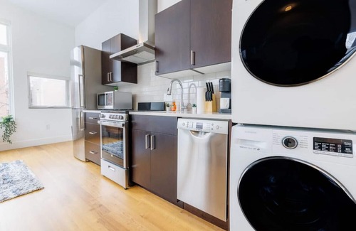 Designed for maximum efficiency, each apartment features top-of-the-line Bosch kitchen appliances, Corian countertops, engineered hardwood floors, individual heating and cooling units, extra storage space, and floor-to-ceiling windows.
