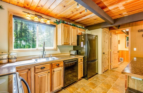 After full days of outdoorsy adventures, take off dirty gear in the mudroom downstairs. The interior is outfitted with classic cabin accents, tall ceilings, and a wood stove to keep everyone warm on chilly evenings. Families with little ones will feel right at home with the baby gate, a Pack-N-Play, plastic dishes and silverware, toys, and books all for guest use. And, the young at heart will love heading up to the loft to indulge in a few games of air hockey! When everyone builds up an appetite, the full kitchen is outfitted with a dishwasher, Keurig, electric stovetop, microwave, and ample cookware to make any recipe a breeze. Extra perks include high-speed WiFi, a private washer and dryer, and beach equipment!