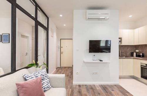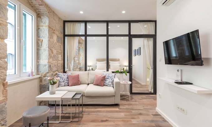 Two room apartment located very close to the historic center of Split and Marmontova street. On the first floor of an old building. Completely renovated, it consists of a living room with convertible sofa, an open fitted kitchen (hob, oven, microwave, fridge, dishwasher, kettle, toaster, coffee maker), a bedroom with a king size bed separated by a glass roof, a bathroom with shower and separate toilet.