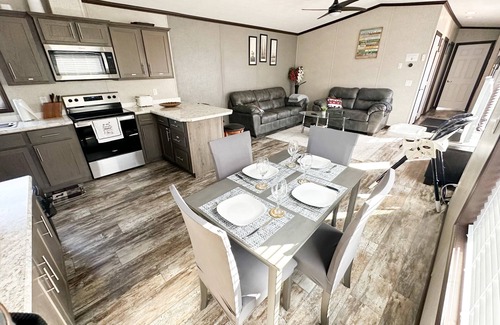 Our newly developed property features a warm and inviting interior, adorned with large windows that frame stunning mountain views of the surrounding. The open-concept living area offers a family entertainment area with smart tv, bluetooth stereo sound system, plush seating, and a fully equipped kitchen, creating a welcoming space for relaxation and shared meals.