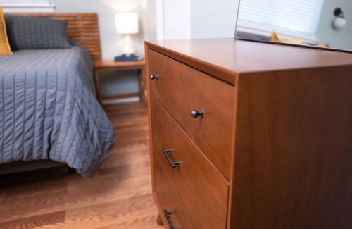 Bedroom 3: Comfortable bedroom with Tempurpedic Queen bed, a small dedicated workspace, and a TV for streaming.