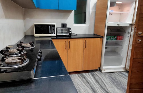 We have a very functional kitchen with electronics like Fridge , Microwave , gas lined stove , electric kettle, oven, toaster, rice cooker etc.