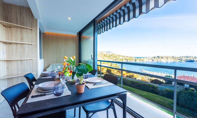 The AGRIANTHE PALMS is a holiday rental apartment that has been completely renovated with luxurious amenities. It is located in Villefranche S/ Mer on the 3rd floor with a lift of a beautiful residence with a swimming pool. It also has air conditioning and a parking space. Its area is 75 square meters and it can accommodate 5 people.It consists of a fully equipped independent kitchen, a living room with a sofa bed for 1 person - a dining area with a sublime sea view, a bedroom with 1 Queen Size bed, a bathroom with a shower, another bedroom / office with a retractable double bed, a bathroom with a shower and a separate toilet.You will be a 10-minute walk from the first shops and the city centre. This town is very attractive with its market and its historic old town. Plage de la Darse is not far away!Stay on the French Riviera with Riviera Holiday Homes and its 25 years of experience in furnished and tourist accommodation.Take advantage of our included or optional additional services: concierge, luggage storage, airport transfer, excursions, etc...Pets not allowed - Wifi internet - Security deposit not debited pre-authorization on card of 1500€ - Non-smoking - private parking