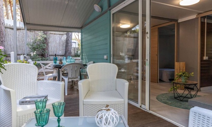 Oltre alle tende e alle piazzole per i camper, la struttura offre 5 case mobili ben attrezzate e confortevoli. Due di queste, Bouganvillea 61 e Mimosa 25, dispongono di una camera matrimoniale, una camera più piccola con tre letti singoli, cucina con dinette, un bagnetto con WC e lavandino, oltre a un bagno più ampio con doccia e veranda spaziosa, ideale per famiglie fino a 5 persone. Due case mobili, Roses e Celestin, sono specificamente attrezzate per ospitare persone con disabilità e offrono una soluzione di 3 posti letto (camera matrimoniale e divano letto) con cucina e veranda accessibile. L'unità Glicine è ideale per fino a 4 persone, con una camera matrimoniale, una cameretta con letto da una piazza e mezzo, cucina con dinette, bagno e una veranda accogliente.