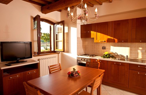 The apartment, finely furnished and equipped with all comforts, is a large two-room apartment (50 m2) with an independent entrance on the ground floor, built following the style of the country villa: ceiling with wooden beams and exposed terracotta tiles.