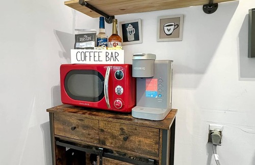 The kitchen is complete with fully functional and authentic retro appliances, a small sitting area, small appliances (microwave, blender, coffee maker, mixer), plenty of dinnerware, silverware, and cookware. We also provide a small coffee bar with Keurig pods and assortment of sweeteners and teas.