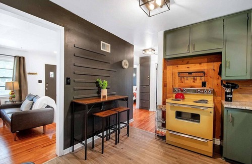 This cozy duplex, situated on a corner lot has plenty of style. Walk into the stylish living room with eclectic retro decor, 58" Smart TV and cozy furniture. The space includes a workspace.